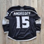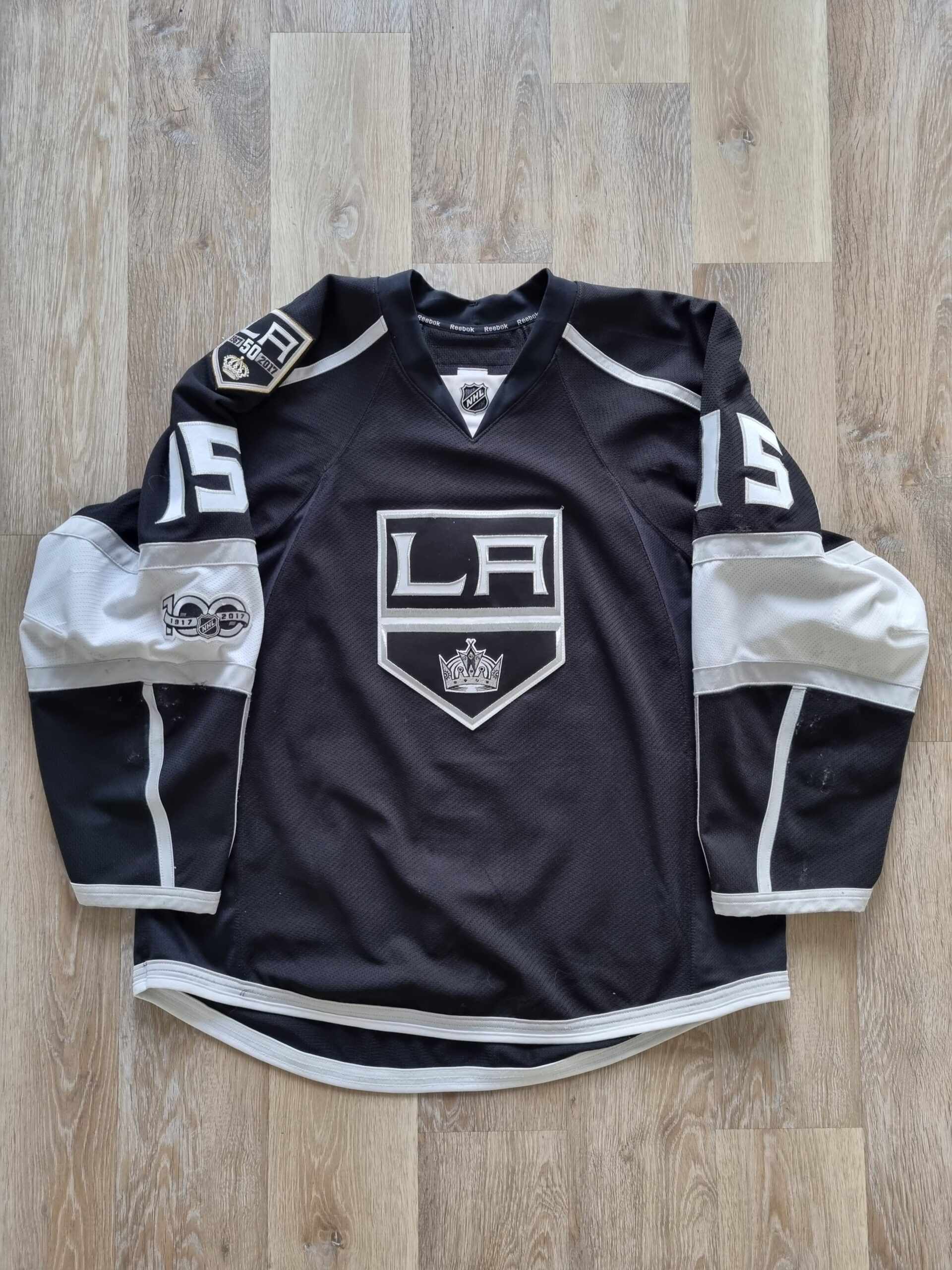 Features: LA 50th anniversay Patch, NHL Centennial Patch. Multiple team repairs and board burns on both sleeves