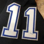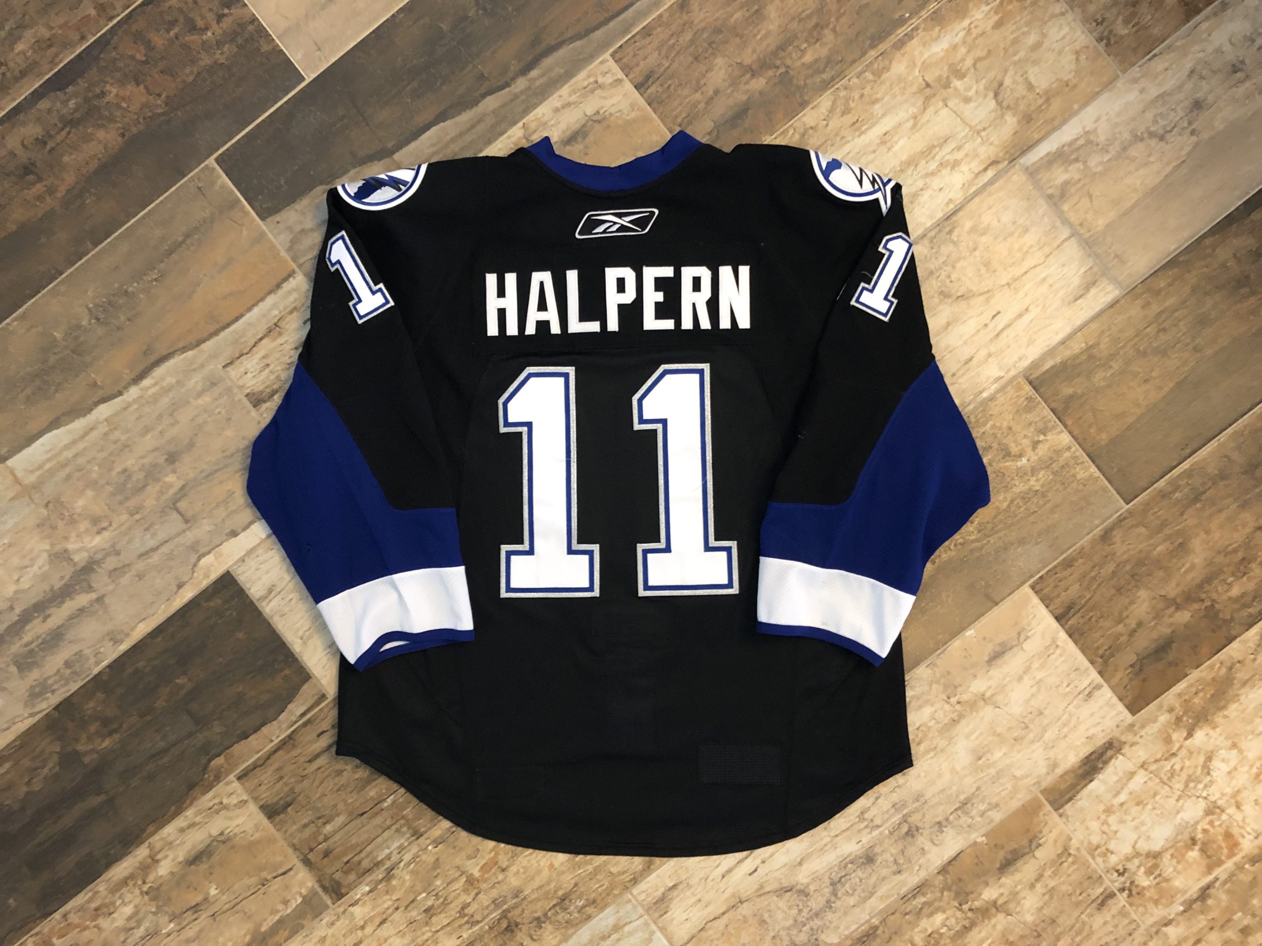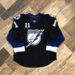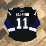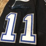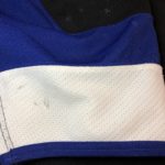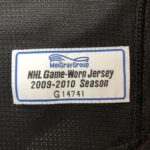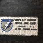 This jersey has quite a few board burns scattered around it. The jersey has a few black marks and some loose threads. It is photomatched to a hole on the left arm and a board burn above the numbers on the right arm. This was from Jeff’s final season with the Lightning. He is now assistant coach for the 2018-19 and 2019-20 team.