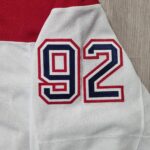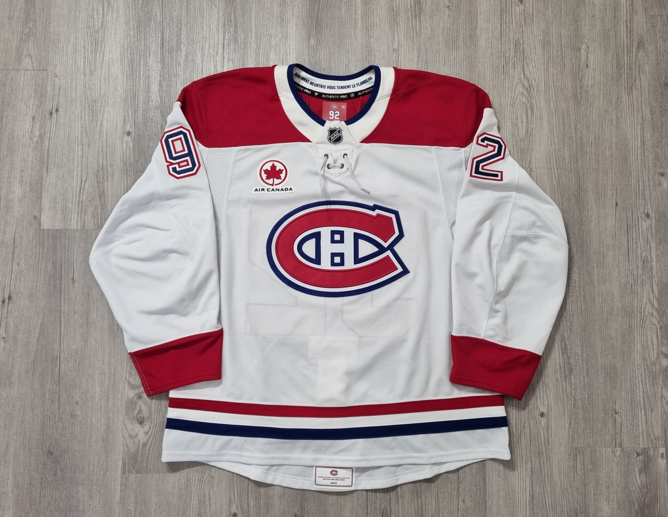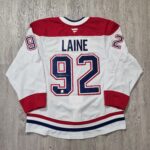 Patrik Laine game-worn away jersey from the 2025–2026 season. The jersey was used in games before December 13, 2025. Laine was injured on October 18, 2025, and before that he played in three away games. The jersey has an Air Canada patch, an authentication tag on the jersey, and COA.