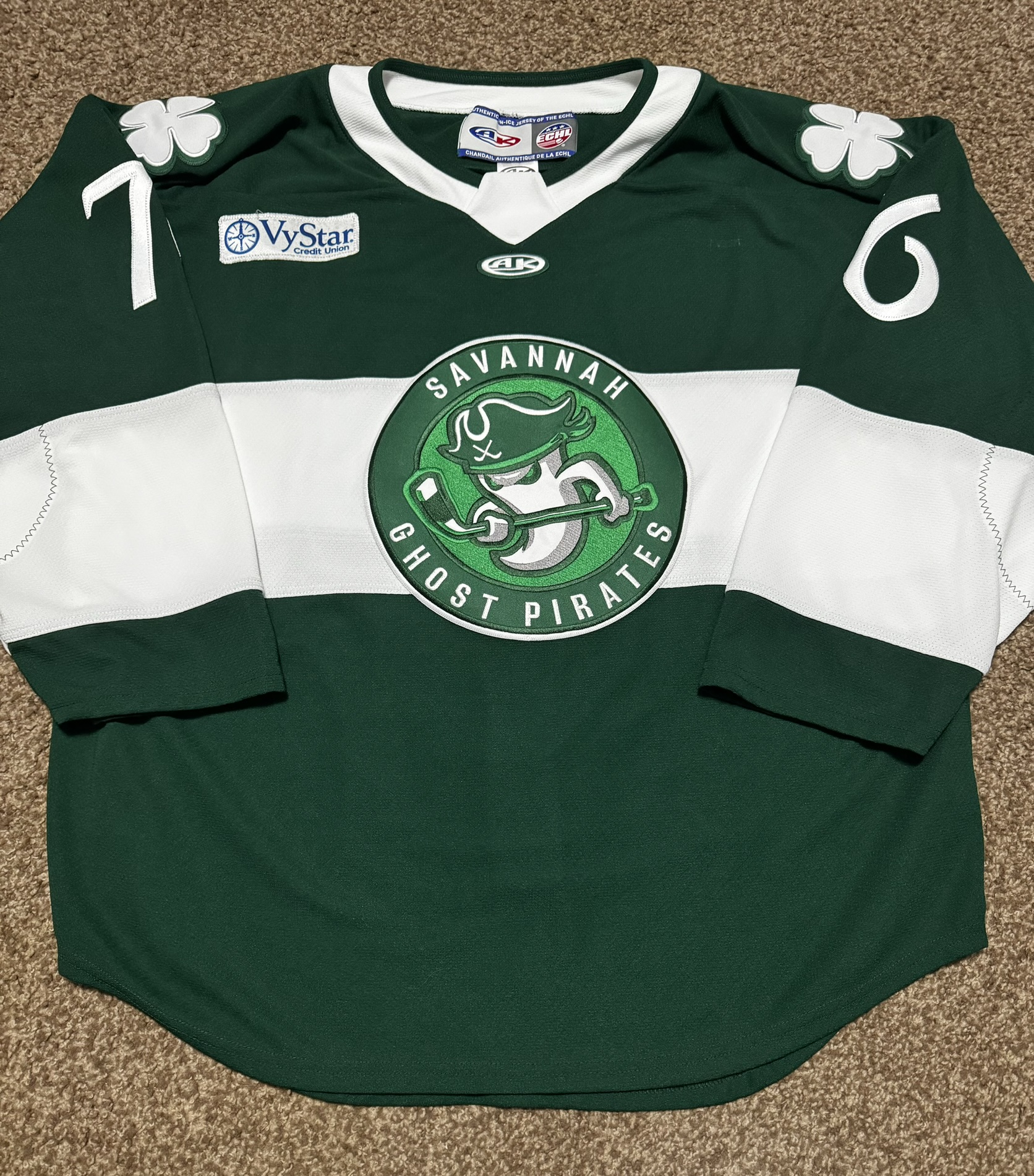 Features: Savannah Ghost Pirates very first St Patricks Day jersey.