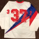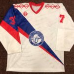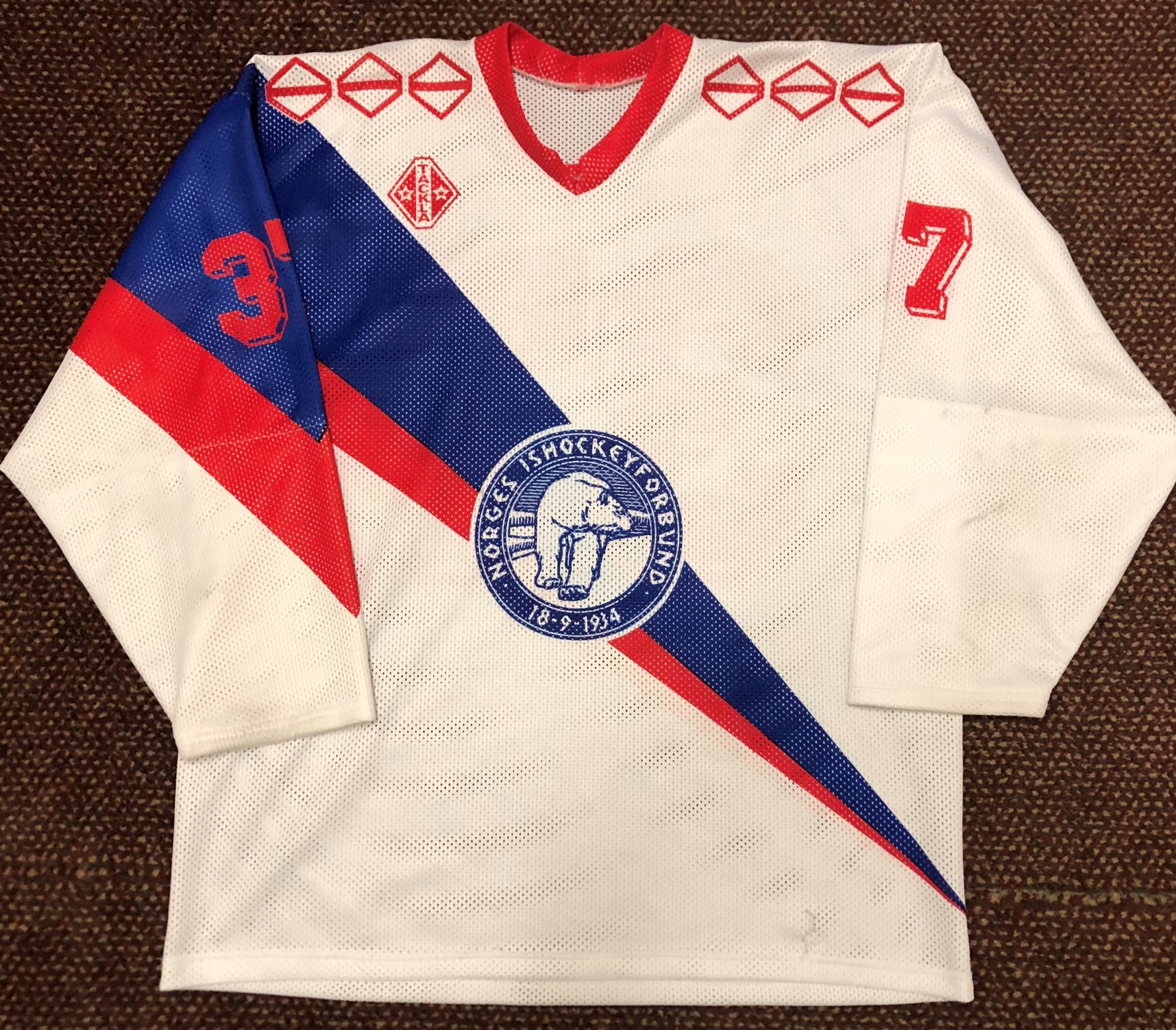 Trying to find out who wore this jersey circa 1992 Team Norway. Possible an Olympic jersey because it has no sponsor patches. Has clear game wear with marks and a nice sized tear on the bottom front and ripped collar seam. Also has the double layered arms from elbow down typical of the Norwegian gamers. It also matches up to photos of the reds worn at Albertville 92 Winter Games.